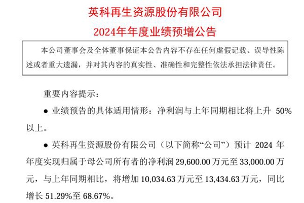 2025年01月16日,英科再生资源股份有限公司发布《2024年年度业绩预增公告》。图源:英科再生公告 公告显示,英科再生预计 2024 年年度实现归属于母公司所有者的净利润29,600.00万元至33,000.00万元,与上年同期相比,将增加10,034.63万元至13,434.63万元,同比增长51.29%至68.67%。 公...