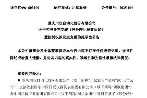 1月15日,重庆川仪自动化股份有限公司(简称:川仪股份)发布公告称,公司直接控股股东中国四联仪器仪表集团有限公司(下称“四联集团”)和中国机械工业集团有限公司(下称“国机集团”)近日签署了《股份转让框架协议》。根据该协议,四联集团拟将所持川仪股份19.25%股权协议转让给国机集团或其新设...