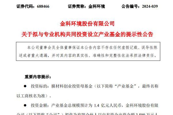 金科环境股份有限公司(简称:金科环境)公告称,公司于 12 月 27 日与湖南航天环保产业基金管理有限公司(下称“航天环保”)签订《合作协议》,拟作为有限合伙人出资参与航天环保下属控股基金管理人北京航科君富私募基金管理中心(有限合伙)发起并管理的膜材料创业投资母基金,总规模预计为 1.4 亿元人民币。其中,金科...