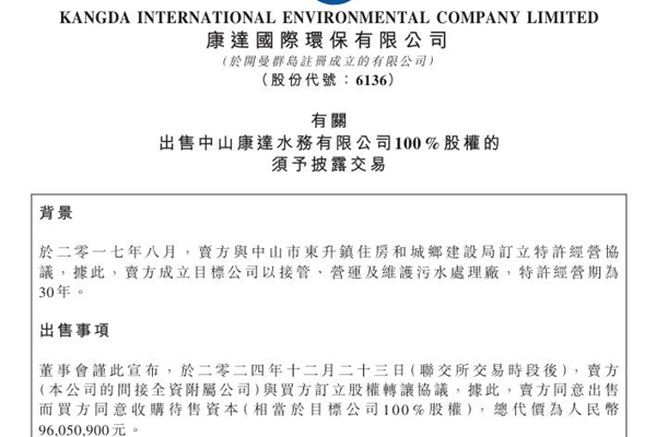 2024年12月23日,康达国际环保有限公司发布《有關出售中山康達水務有限公司100%股權的須予披露交易》。图源:康达环保公告 公告称,康达环保间接全资附属公司重庆康达环保产业(集团)有限公司拟向中山市小榄水务有限公司出售中山康达水务有限公司100%股权,总代价为人民币9605.09万元。 公告表示,综合考虑污水处理厂的当前营运状...
