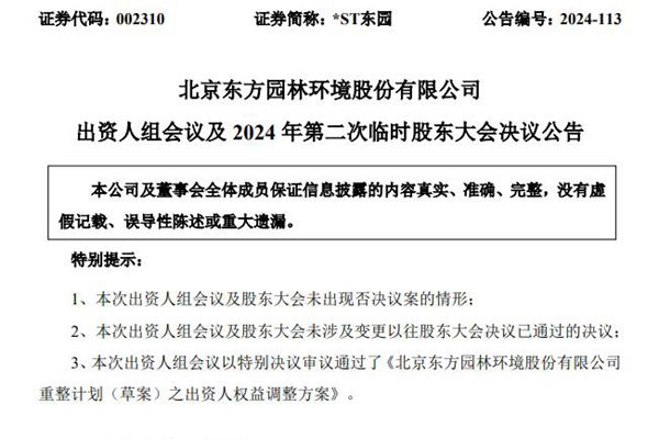 北京东方园林环境股份有限公司(简称:*ST东园,下称“东方园林”)近日发布《出资人组会议及 2024 年第二次临时股东大会决议公告》。公告显示,东方园林采取现场投票与网络投票相结合的方式,于12月20日下午召开了出资人组会议及股东大会,一是以特别决议审议通过《北京东方园林环境股份有限公司重整计划(草案)之出资人...