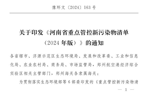 关于印发《河南省重点管控新污染物清单(2024年版)》的通知 各省辖市、济源示范区生态环境局、发展和改革委、工业和信息化局、农业农村局、商务局、市场监管局,郑州航空港经济综合实验区相关主管部门,郑州海关各隶属海关: 为贯彻落实生态环境部等6部委印发的《重点管控新污染物清单(2023年版)》(生态环境部令第28号),按照省人民政府办公厅...
