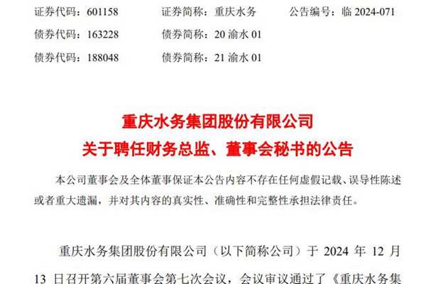 重庆水务集团股份有限公司(简称:重庆水务)公告称,公司审议通过了《重庆水务集团股份有限公司关于聘任财务总监、董事会秘书的议案》,同意聘任郭剑先生为公司财务总监、董事会秘书,任期自本次董事会审议通过之日起,至本届董事会到期之日止。 郭剑,男,汉族,1974 年 1 月出生,中共党员,硕士研究生,高级会计师。 1996 年 7 月至 ...