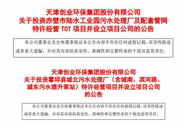 天津创业环保集团股份有限公司(简称:创业环保)近日连发两则公告。 ①投资赤壁市陆水工业园污水处理厂及配套管网特许经营 TOT 项目并设立项目公司 创业环保近期通过参与公开招标的方式中标赤壁市陆水工业园污水处理厂及配套管网项目特许经营 TOT 项目,按招标文件要求,需要设立项目公司,由项目公司负责本项目的投融资、运营维护及移交工作。...