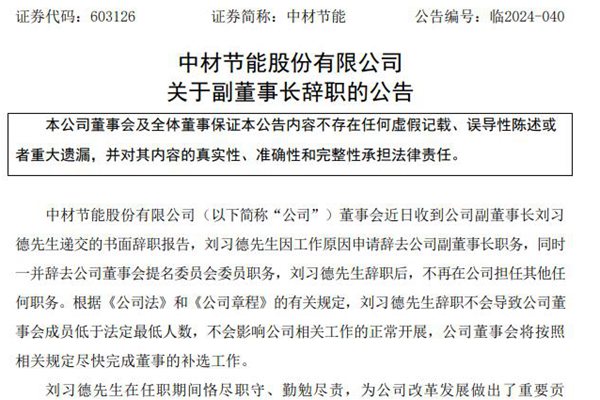 中材节能股份有限公司(简称:中材节能)11月8日公告称,公司董事会近日收到了副董事长刘习德先生递交的书面辞职报告,刘习德先生因工作原因申请辞去公司副董事长职务,同时一并辞去公司董事会提名委员会委员职务,刘习德先生辞职后,不再在公司担任其他任何职务。 根据《公司法》和《公司章程》的有关规定,刘习德先生辞职不会导致中材节能董事会成员低于...