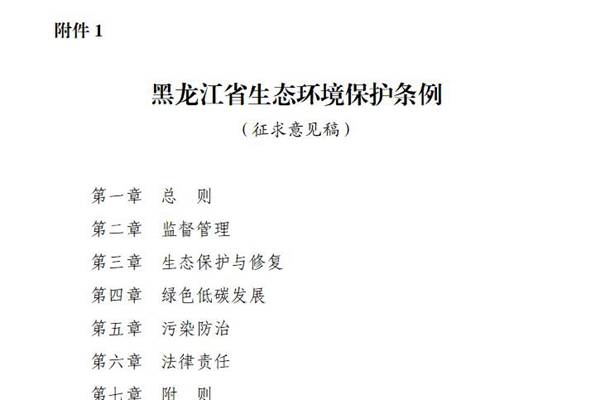 关于公开征求《黑龙江省生态环境保护条例(征求意见稿)》修改意见的公告 为进一步增强立法的公开性和透明度,推进公众参与政府立法,提高立法质量,现将《黑龙江省生态环境保护条例(征求意见稿)》全文公布,征求社会公众意见。有关单位和个人可以在2024年11月11日前,通过以下3种方式提出意见: 一、登录黑龙江省生态环境厅网站(网址:http:...
