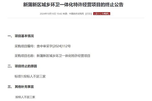 10月10日,贵州省遵义市新蒲新区城乡环卫一体化特许经营项目发布项目终止公告,公告显示项目终止的原因为投标人不足三家。 该项目预算金额为1944638600元,服务范围包括新蒲新区行政辖区内城乡垃圾收集转运及渗滤液处置、道路清扫保洁、公厕管护、城乡生活垃圾分类及垃圾资源化利用等。 该项目为存量项目,存量资产净值12,932.78万...
