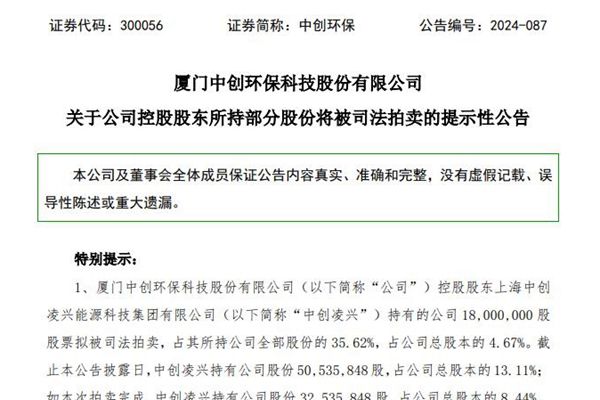 8月2日,厦门中创环保科技股份有限公司(简称:中创环保)发布《关于公司控股股东所持部分股份将被司法拍卖的提示性公告》。根据该公告,上海中创凌兴能源科技集团有限公司(下称“中创凌兴”)持有的中创环保4.67%股权将被司法拍卖。 本次拍卖自8月5日10:00开始,将于8月6日10:00截止,原因系“债...