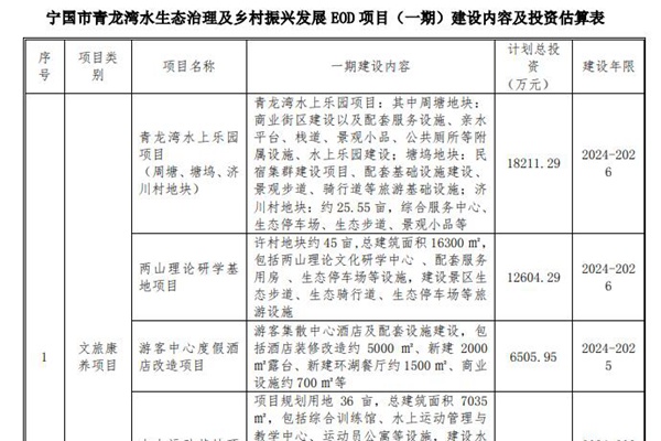 安徽省宁国市青龙湾水生态治理及乡村振兴发展EOD模式项目一期项目招标公告发布。 招标人:宁国市青龙湾生态开发有限公司 招标项目编号:NGS-GC-GK-2024574 合同估算价:109873.54万元; 合作期限:20年;其中建设期3年,运营期17年; 招标内容、规模和范围:安徽省宁国市青龙湾水生态治理及乡村振兴发展EOD...