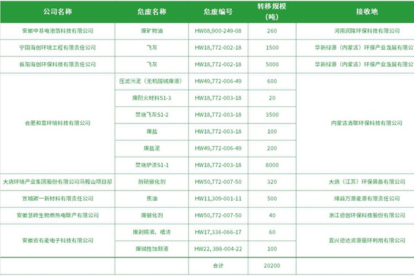 近日,安徽省生态环境厅同意了一批危险废物跨省转移申请,包括安徽省有能电子科技有限公司废剥锡液、槽渣(HW17,336-066-17)60 吨、废碱性蚀刻液(HW22, 398-004-22)100吨;安徽慧峰生物质热电联产有限公司废催化剂(HW50,772-007-50)40吨;宣城碳一新材料有限责任公司焦油(HW11,309-001...