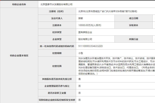 来自北京产权交易所的信息显示,北京国泰节水发展股份有限公司 2000万股股份(占总股本的20%)挂牌转让,转让底价513.343万元,披露日期截至2024年8月1日。 国泰节水,注册资本10000.00万元(人民币),实收资本8094.00万元(人民币),属于国有参股企业,所属行业软件和信息技术服务业。规模显示,国泰节水为小型企业,...