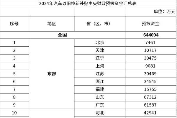 财政部近日发布通知,宣布下达2024年汽车以旧换新补贴中央财政预拨资金预算,总计约64.4亿元。 下面是原文↓ 财政部关于下达2024年汽车以旧换新补贴中央财政预拨资金预算的通知 财建〔2024〕129号 各省、自治区、直辖市财政厅(局),新疆生产建设兵团财政局: 根据财政部会同有关部门印发的《关于印发〈推动消费品...