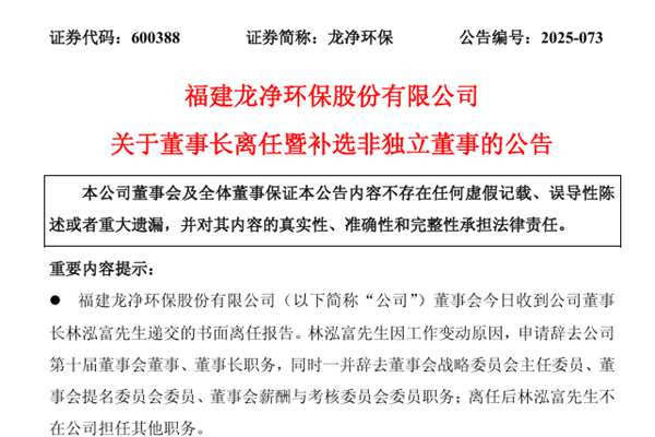 福建龙净环保股份有限公司(简称:龙净环保)近日公告称,公司已收到董事长林泓富先生递交的书面离任报告。林泓富先生因工作变动原因,申请辞去公司第十届董事会董事、董事长职务,同时一并辞去董事会战略委员会主任委员、董事会提名委员会委员、董事会薪酬与考核委员会委员职务;离任后林泓富先生不在公司担任其他职务。 龙净环保于2025年10月24日召...