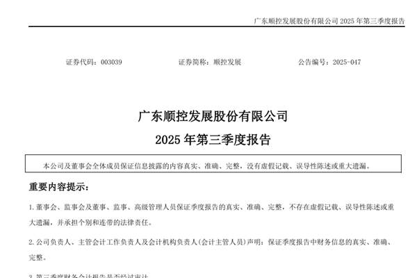 广东顺控发展股份有限公司(简称:顺控发展)近日发布《2025年第三季度报告》。2025年前三季度,顺控发展实现营业总收入16.42亿元,同比增长23.06%;归母净利润2.09亿元,同比增长2.01%;扣非净利润1.99亿元,同比增长1.58%;经营活动产生的现金流量净额为3.97亿元,同比增长17.67%。图源:顺控发展公告 资料...