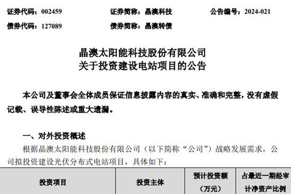 3月18日,晶澳科技发布公告称,拟投资建设三个分布式光伏项目,预计合计投资金额1.22亿元。 其中,晶澳(扬州)晶辉园区11.56MW分布式光伏发电项目预计投资约3600万元、晶澳(扬州)晶运园区11.68MW分布式光伏发电项目预计投资约3155万元、石家庄晶澳18MW分布式光伏发电项目预计投资约5489万元。 对于投资的目的及对...