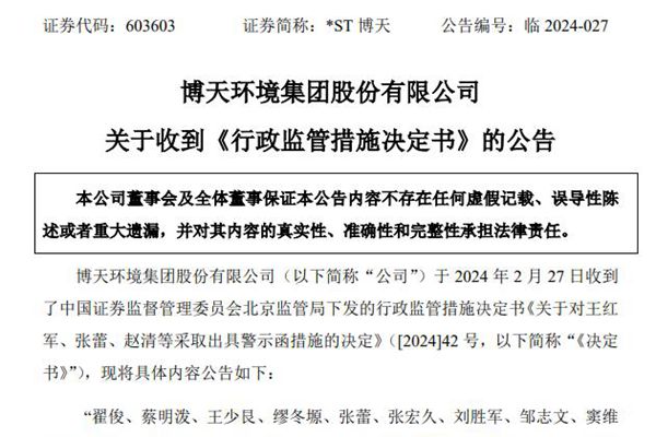 2024年2月28日,博天环境集团股份有限公司(简称:博天环境)发布“关于收到《行政监管措施决定书》的公告”。经查,博天环境多次虚增、虚减营业收入等,导致2017 年、2018 年、2019 年、2020 年、2021 年年报、2022 年度一季报、半年报、三季报信息披露不准确。 申明:本站发布此信息的目的在...