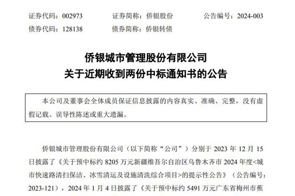 近期,侨银城市管理股份有限公司(简称:侨银股份)收到两份中标通知书,总计金额逾1.3亿元。 项目 1:2024 年度《城市快速路清扫保洁、冰雪清运及设施清洗综合项目》 1.采购人:乌鲁木齐市城市公共设施应急抢险中心(乌鲁木齐市环卫特种作业中心); 2.招标代理机构:新疆西北招标有限公司; 3. 标项名称:乌鲁木齐市城市公共设施...