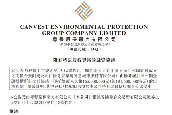 粤丰环保电力有限公司(简称:粤丰环保)近日发布公告,表示公司间接全资附属公司曲阳粤展环境智慧城市服务有限公司(下称“曲阳粤展”)已经与一间金融机构签订协议,获授总额人民币1.65亿元的定期贷款,贷款期限为11年。 公告显示,贷款协议订明(其中包括)控股股东须于本公司持有之最低股权百分比要求。根据协议,倘(其中...