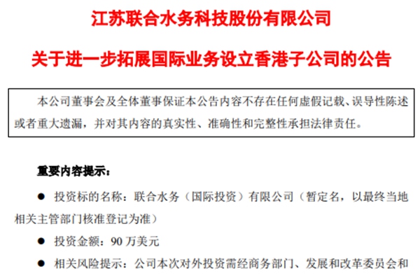 2024年1月4日公告,江苏联合水务科技股份有限公司(下称“联合水务”)拟注资90万美元设立中国香港子公司,进一步拓展国际业务。 公告提及,根据公司战略规划与经营发展的需要,为进一步加快国际布局,公司拟以自有资金90万美元在中国香港投资设立全资子公司联合水务(国际投资)有限公司(暂定名)。 对于本次对外投资...
