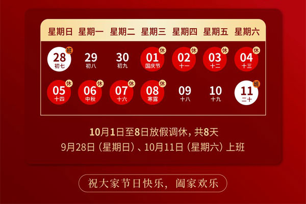 丹桂飘香,举国同庆;邀一轮明月,洒一片辉煌。值此国庆、中秋节来临之际,环保在线全体工作人员向您致以节日的问候与祝福! 根据《国务院办公厅关于2025年部分节假日安排的通知》,结合本公司实际情况,现将2025年国庆节&中秋节放假事项通知如下: 国庆节&中秋节放假时间为2025年10月1日-10月8日,共放假8天,9月28日(周日)、...