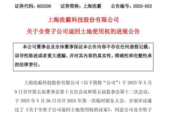 上海洗霸科技股份有限公司(简称:上海洗霸)近日公告称,近期,公司及全资子公司上海洗霸环保科技有限公司(下称“上海洗霸环保”)与上海市嘉定区规划和自然资源局和上海市嘉定区土地储备中心签订《嘉定区嘉定新城F01C-01 地块土地收回协议书》,并已全额收到上海市嘉定区土地储备中心支付的地块收回费用10,215.20万...