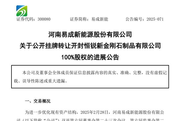 7月25日,河南易成新能源股份有限公司(简称:易成新能)公告称,公司已收到河南中原产权交易有限公司出具的《挂牌结果通知书》,截止第二次公开挂牌日期届满,未征集到符合条件的意向受让方。经公司审慎研究,现决定对开封恒锐新金刚石制品有限公司(下称“恒锐新”)100%股权的公开挂牌转让事项予以暂停,公司将根据实际情况,...