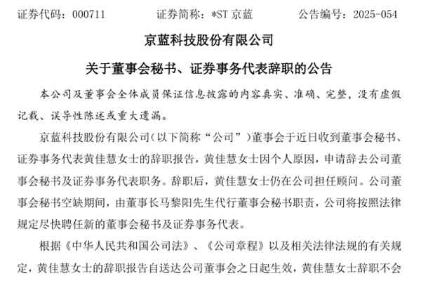 京蓝科技股份有限公司(简称:*ST京蓝)6月30日公告称,因个人原因,公司董事会秘书、证券事务代表黄佳慧女士已申请辞职。辞职后,黄佳慧女士仍在公司担任顾问。公司董事会秘书空缺期间,由董事长马黎阳先生代行董事会秘书职责,公司将按照法律规定尽快聘任新的董事会秘书及证券事务代表。图源:*ST京蓝公告 申明:本站发布此信息的目的在于传播更多...