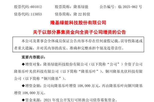隆基绿能科技股份有限公司(简称:隆基绿能)近日公告称,公司拟向全资子公司隆基乐叶光伏科技有限公司(下称“隆基乐叶”)增资108,000万元、向全资孙公司铜川隆基光伏科技有限公司(下称“铜川隆基”)增资108,000万元,资金来源2021年度公开发行可转换公司债券募集资金。 隆基乐叶成立...