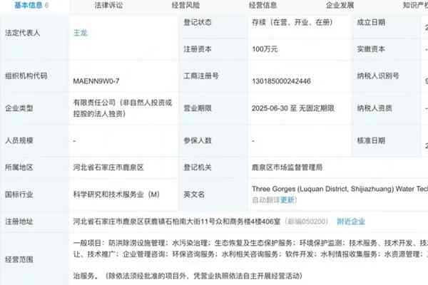 6月30日,三峡(石家庄鹿泉区)水务技术服务有限公司正式成立,注册资本100万元,由中国三峡新能源(集团)股份有限公司100%持股。 该公司所属行业为水的生产和供应业,经营范围涉及防洪除涝设施管理、水污染治理、生态恢复及生态保护服务、环境保护监测、技术服务、技术开发、技术咨询、技术交流、技术转让、技术推广、企业管理咨询、环保咨询服务...