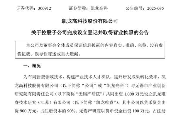 凯龙高科技股份有限公司(简称:凯龙高科)公告称,凯龙唯睿技术研究(江苏)有限公司(下称“凯龙唯睿”)已完成工商登记注册,并取得无锡市惠山区数据局颁发的营业执照,经营范围涉及检验检测服务、汽车零部件研发、汽车零部件及配件制造、信息系统集成服务等等。 据悉,该公司由凯龙高科与无锡市产业创新研究院有限责任公司共同出...