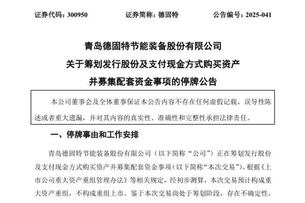 青岛德固特节能装备股份有限公司(简称:德固特)近日公告称,公司正在筹划发行股份及支付现金方式购买资产并募集配套资金事项。为保证公平信息披露,维护投资者利益,避免对证券交易造成重大影响,德固特股票自2025年6月30日开始起停牌,预计最晚将在2025年7月14日开市起复牌并终止筹划相关事项。 据悉,德固特此次交易标的公司为浩鲸云计算科...