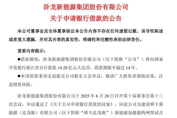 2025年06月21日,卧龙新能源集团股份有限公司发布《关于申请银行借款的公告》。图源:卧龙新能公告 卧龙新能将向国家开发银行浙江省分行借款14.20亿元人民币,借款期限不超过14年。 公司同意将舜丰达茂旗的应收账款提供质押担保,即舜丰达茂旗新能源加储能构网型试点示范项目建成后舜丰新能源(达茂旗)有限公司享有的电费收费权及其项下全...