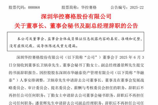 6月3日晚间,深圳华控赛格股份有限公司(简称:华控赛格)公告称,因控股股东深圳市华融泰资产管理有限公司(下称“深圳华融泰”)人事安排调整,卫炳章申请辞去公司董事长、董事及在董事会发展战略委员会、审计委员会、提名委员会、薪酬与考核委员会担任的职务,辞职后不再担任公司任何职务。 同时,丁勤申请辞去公司董事会秘书职...