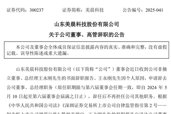山东美晨科技股份有限公司(简称:美晨科技)公告称,公司董事会近日收到非独立董事、总经理王永刚先生的书面辞职报告。王永刚先生因个人原因,申请辞去公司董事、总经理职务(原任职期限与第六届董事会任期一致,即自2024年5月10日起至第六届董事会届满之日止),辞任后不再担任公司其他职务。 在聘任新的总经理之前,美晨科技董事长刘子传先生将代为...
