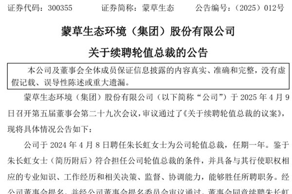 蒙草生态环境(集团)股份有限公司(简称:蒙草生态)4月9日公告称,公司董事会同意续聘朱长虹女士担任公司轮值总裁。图源:蒙草生态 申明:本站发布此信息的目的在于传播更多信息,与本站立场无关。并且郑重提示所有阅读者,股市有风险,投资需谨慎,本文不作为任何投资的参考意见和依凭。...