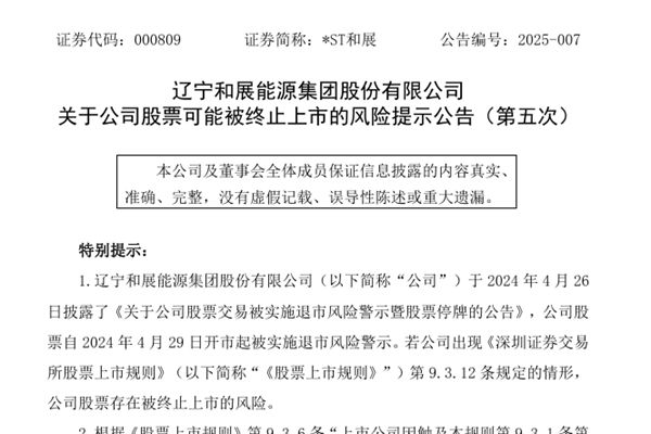 3月20日,辽宁和展能源集团股份有限公司(简称:*ST和展)发布《关于公司股票可能被终止上市的风险提示公告(第五次)》。据悉,根据2023年度审计报告,*ST和展2023年度经审计的净利润为负值且营业收入低于1 亿元,根据《股票上市规则》第9.3.1条第一款第一项之规定,公司股票自2024年4月29日开市起被实施退市风险警示。 若公...