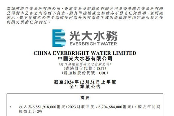 港股上市公司中国光大水务有限公司(简称:中国光大水务)近日发布《截至2024年12月31日止年度全年业绩公告》。据该公告,2024财年,中国光大水务收入为68.52亿港元,较2023财年的67.05亿港元增长2%;归母净利润为10.2亿港元,同比减少14%。图源:中国光大水务公告 申明:本站发布此信息的目的在于传播更多信息,与本站立...