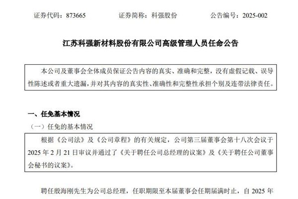 近日,光伏材料“新势力”江苏科强新材料股份有限公司(简称:科强股份)公告称,公司总经理周明、副总经理毕瑞贤因个人原因辞去原职务,辞职自当日起生效。周明仍继续担任董事长,毕瑞贤保留董事职务。截至公告日,周明持有公司15.93%股份,毕瑞贤持股9.19%。 同一日,科强股份发布了新的人事任命:聘任殷海刚先生为公司...