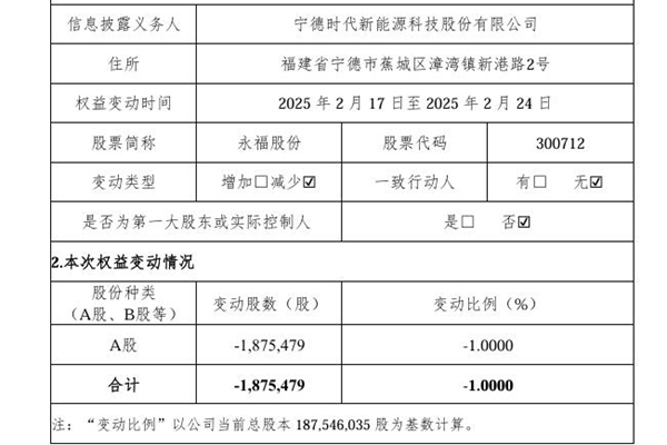 2025年02月24日,福建永福电力设计股份有限公司发布《关于持股 5%以上股东权益变动触及 1%整数倍的公告》。图源:永福股份公告 公告表示,永福股份于2025年2月24日收到股东宁德时代新能源科技股份有限公司出具的《关于权益变动的告知函》,获悉宁德时代于2025年2月17日至2025年2月24日期间通过集中竞价、大宗交易方式累计...
