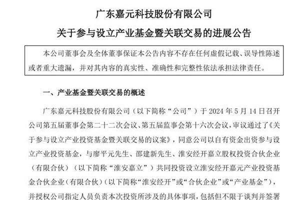 2025年01月01日,广东嘉元科技股份有限公司发布《关于参与设立产业基金暨关联交易的进展公告》。图源:嘉元科技公告 公告表示,第五届董事会第二十二次会议、第五届监事会第十六次会议,审议通过了《关于参与设立产业投资基金暨关联交易的议案》,同意公司以自有资金出资参与设立产业投资基金,共同投资设立淮安经开嘉元产业投资基金合伙企业(有限合...