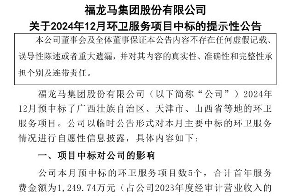 2025年01月02日,福龙马集团股份有限公司发布《关于2024年12月环卫服务项目中标的提示性公告》。图源:福龙马公告 公告表示,截至2024年12月31日,福龙马在履行的环卫服务项目年化合同金额42.70亿元,累计合同总金额347.30亿元(含项目顺延服务年限合同金额及已中标项目补充合同金额)。 申明:本站发布此信息的目的在于...