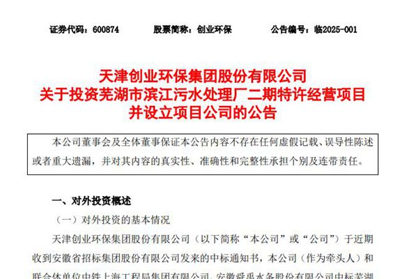 天津创业环保集团股份有限公司(简称:创业环保)近日公告称,公司已经收到了安徽省招标集团股份有限公司发来的中标通知书,公司作为牵头人,和联合体单位中铁上海工程局集团有限公司、安徽舜禹水务股份有限公司中标芜湖市滨江污水处理厂二期工程特许经营项目,该项目总投资 2.77 亿元。 本项目采用特许经营 BOT 模式实施,建设规模 6 万 m&...