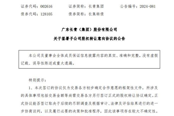 广东长青(集团)股份有限公司(简称:长青集团)近日公告称,公司拟将全资子公司鱼台长青环保能源有限公司(下称“长青环保能源”)的 100%股权转让给鱼台县华兴新能源有限公司,由鱼台县人民政府授意。12月5日,三方就股权转让事宜达成意向,并签署《股权转让意向协议》。 本次交易转让价格为 40,100 万元:其中 ...