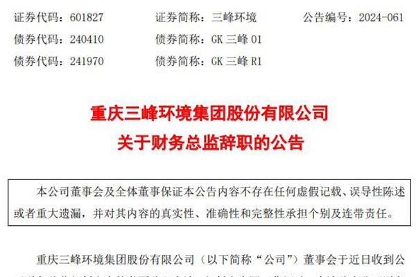 重庆三峰环境集团股份有限公司(简称:三峰环境)近日公告称,因工作调动,郭剑先生申请辞去公司财务总监职务。根据公司职业经理人相关管理制度,郭剑先生的辞职申请已经公司董事会于 2024 年 12 月 5 日召开的第二届董事会第三十一次会议审议通过。郭剑先生辞职后不再担任公司其他职务。图源:三峰环境公告 申明:本站发布此信息的目的在于传播...
