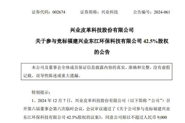 兴业皮革科技股份有限公司(简称:兴业科技)12月7日公告称,公司拟以不超过人民币 9,000万元(含本数),参与竞标福建兴业东江环保科技有限公司(下称“兴业东江环保”)42.5%股权,实际受让价以广东联合产权交易中心最终竞拍受让价为准。 据悉,2024 年 12 月,广东联合产权交易中心挂出“福建...