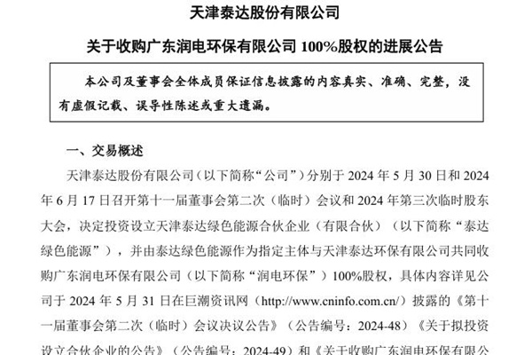 2024年11月30日,天津泰达股份有限公司发布《关于收购广东润电环保有限公司 100%股权的进展公告》。图源:泰达股份公告 公告显示,目前,泰达绿色能源已注册成立,交易各方已签署股权转让相关协议,并完成润电环保 100%股权的交割工作。润电环保完成了工商登记变更,并取得新的《营业执照》。本次收购完成后,润电环保将成为公司的控股子公...