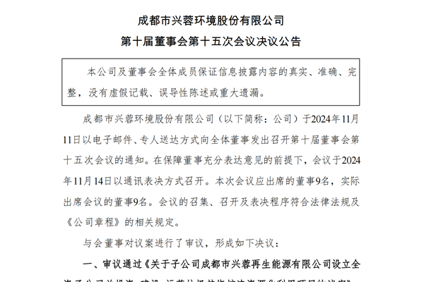 2024年11月15日,成都市兴蓉环境股份有限公司发布《第十届董事会第十五次会议决议公告》。图源:兴蓉环境公告 公告显示,会议审议通过《关于子公司成都市兴蓉再生能源有限公司设立全资子公司并投资、建设、运营垃圾焚烧炉渣资源化利用项目的议案》;审议通过《关于子公司成都市排水有限责任公司与成都交子公园置业有限公司成立合资公司并开展成都交子...