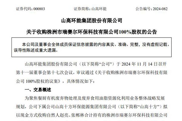 11月15日,山高环能集团股份有限公司(简称:山高环能)公告,公司下属公司山高十方环保能源集团有限公司拟以现金方式收购自然人赵亮、张郴林合计持有的株洲市瑞赛尔环保科技有限公司(下称“株洲瑞赛尔”)100%股权,并取得目标公司全资子公司株洲市善瑞环保科技有限公司(下称“株洲善瑞”)100%...