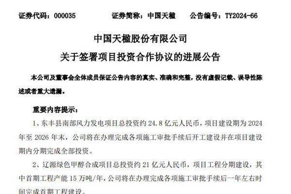 11月1日,中国天楹股份有限公司发布《关于签署项目投资合作协议的进展》的公告,公告显示,中国天楹全资子公司东丰至能风电有限公司与辽源市东丰县人民政府正式签署《东丰县南部风电项目投资合作协议》,中国天楹全资子公司辽源天楹制醇科技有限公司与辽源高新技术产业开发区管委会正式签署《绿色甲醇项目投资合作协议书》。协议签署后,合作各方将按照协议约...