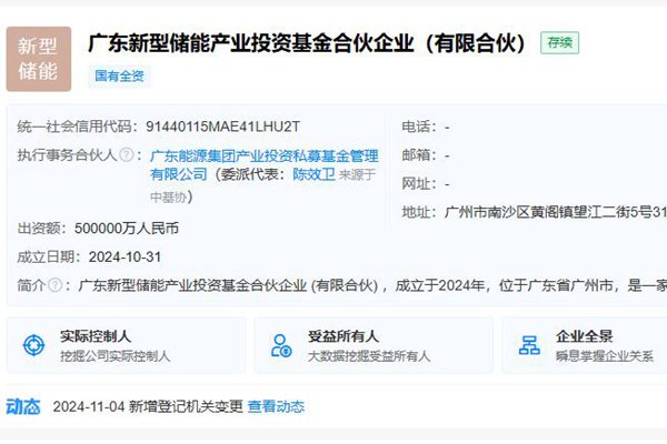 天眼查数据显示,广东新型储能产业投资基金合伙企业(有限合伙)10月31日成立,执行事务合伙人为广东能源集团产业投资私募基金管理有限公司,出资额50亿人民币,经营范围为以私募基金从事股权投资、投资管理、资产管理等活动。 合伙人信息显示,该基金由广东省能源集团有限公司、广东能源集团产业投资私募基金管理有限公司共同出资。图源:天眼查...